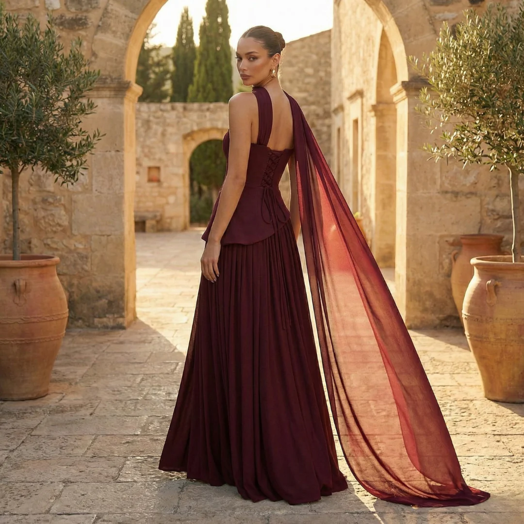At the back, delicate lace-up detailing offers adjustability and allure, while the detachable scarf adds a whisper of vintage romance. In its deep Cherry Lacquer hue, Malén makes a confident statement — refined, dramatic, unforgettable.