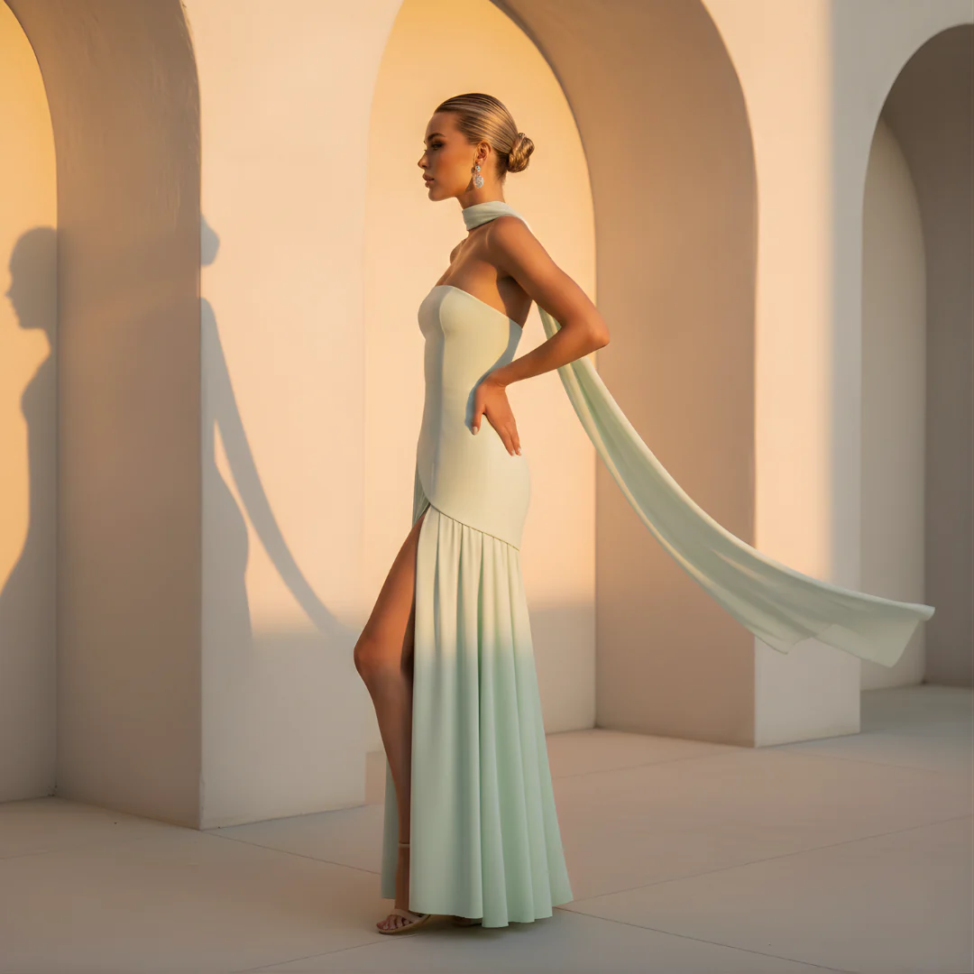 The Maliyah Maxi Dress in Mint combines ethereal elegance with a modern edge, making it a standout choice for any special occasion. This stunning strapless gown features a structured non-stretch crepe bodice that beautifully complements the flowing contrast chiffon skirt. The asymmetrical hem adds a unique touch, while the delicate lace-up back ensures a perfect fit. With a thigh-high split, this dress exudes confidence and sophistication, allowing you to make a bold statement with every step.