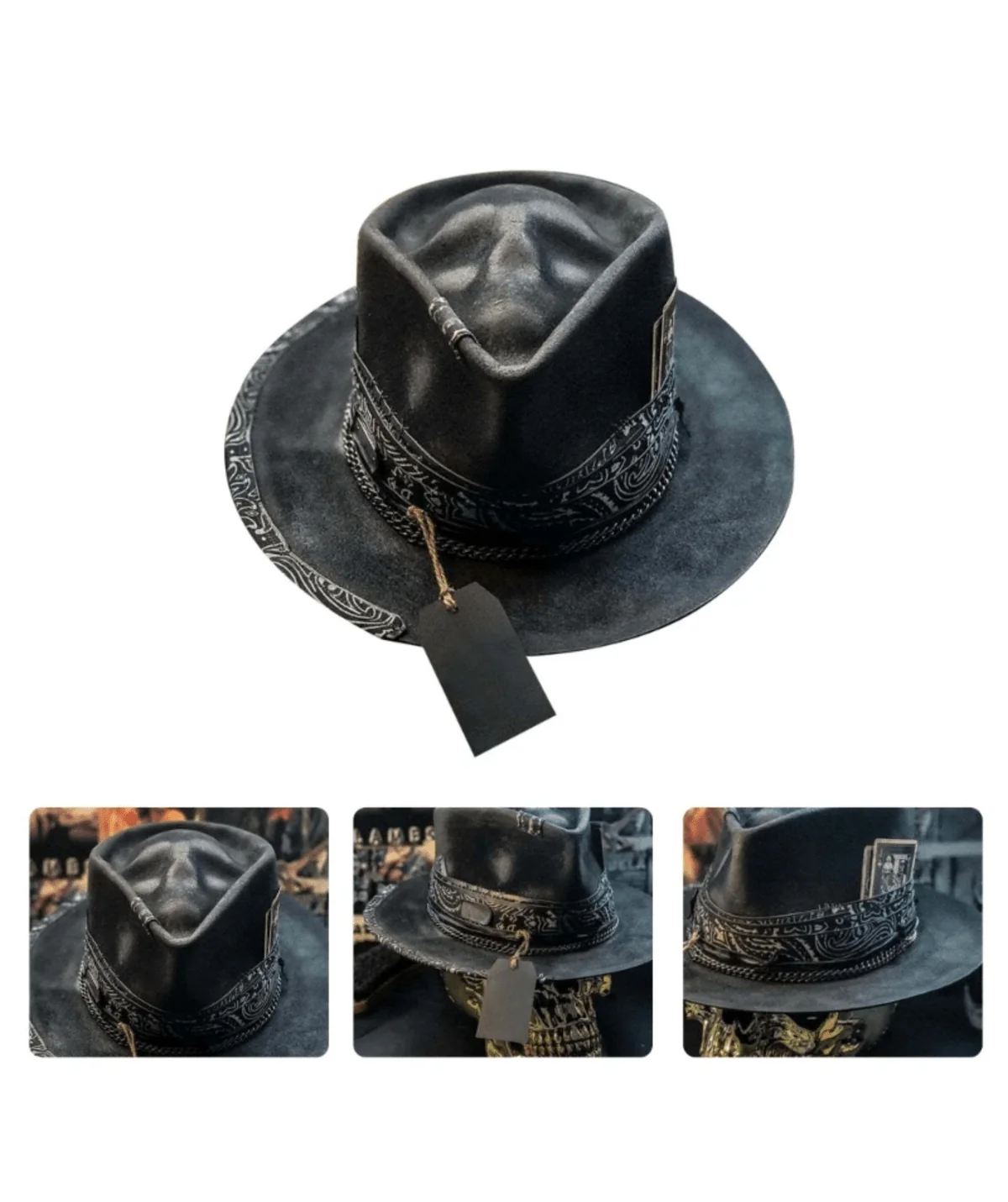 Make a bold statement with this unique cowboy hat featuring a striking skull design. Crafted from a premium wool blend, this accessory combines durability with style, making it a must-have for those looking to add an edgy touch to their outfits.