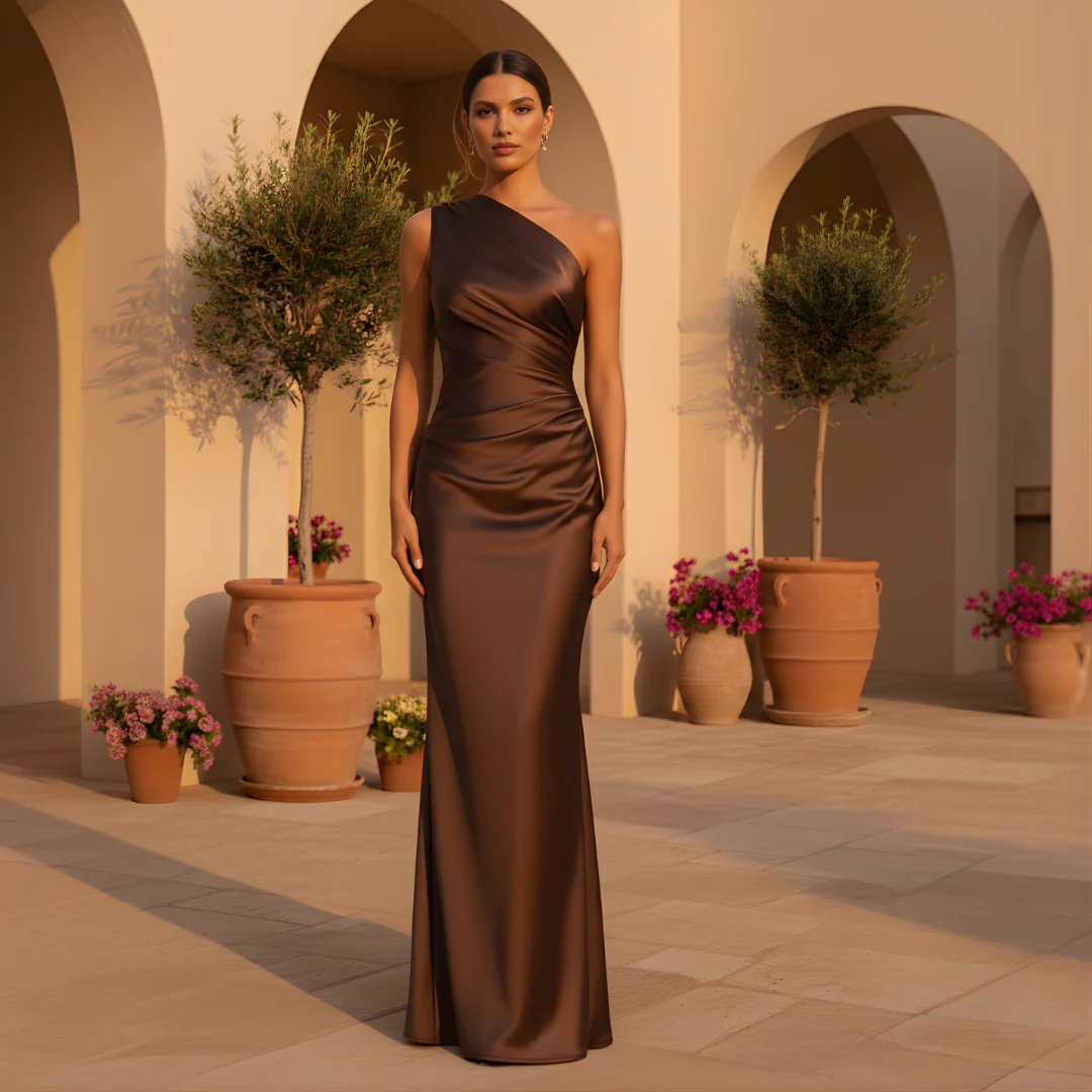 Step into timeless elegance with this Chocolate Brown Satin Maxi Dress, designed for women who want a graceful yet striking look for evening events. The one-shoulder design adds a modern, fashion-forward touch while the smooth satin fabric drapes beautifully over your silhouette.
