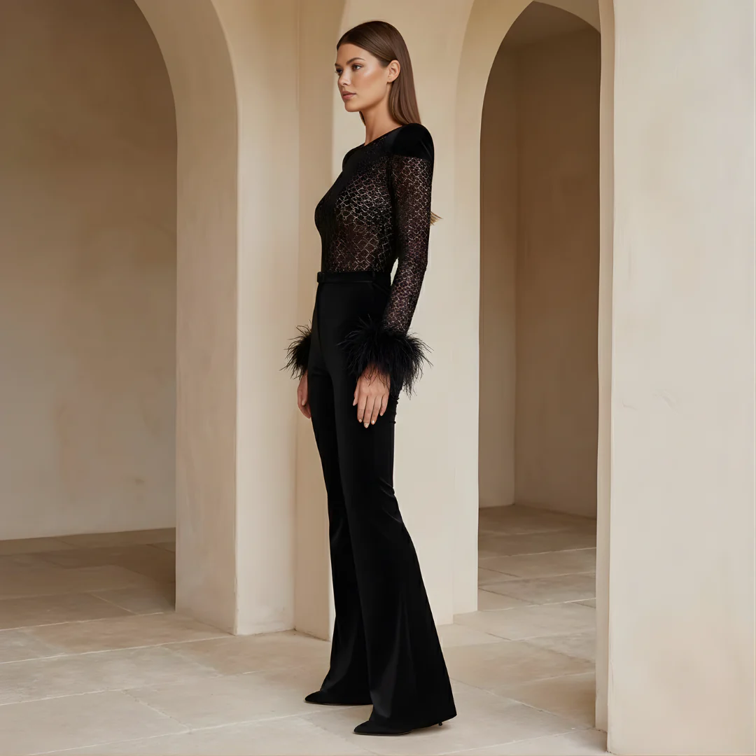 Women's Black Sequin Jumpsuit – Elegant Lace and Feather Design